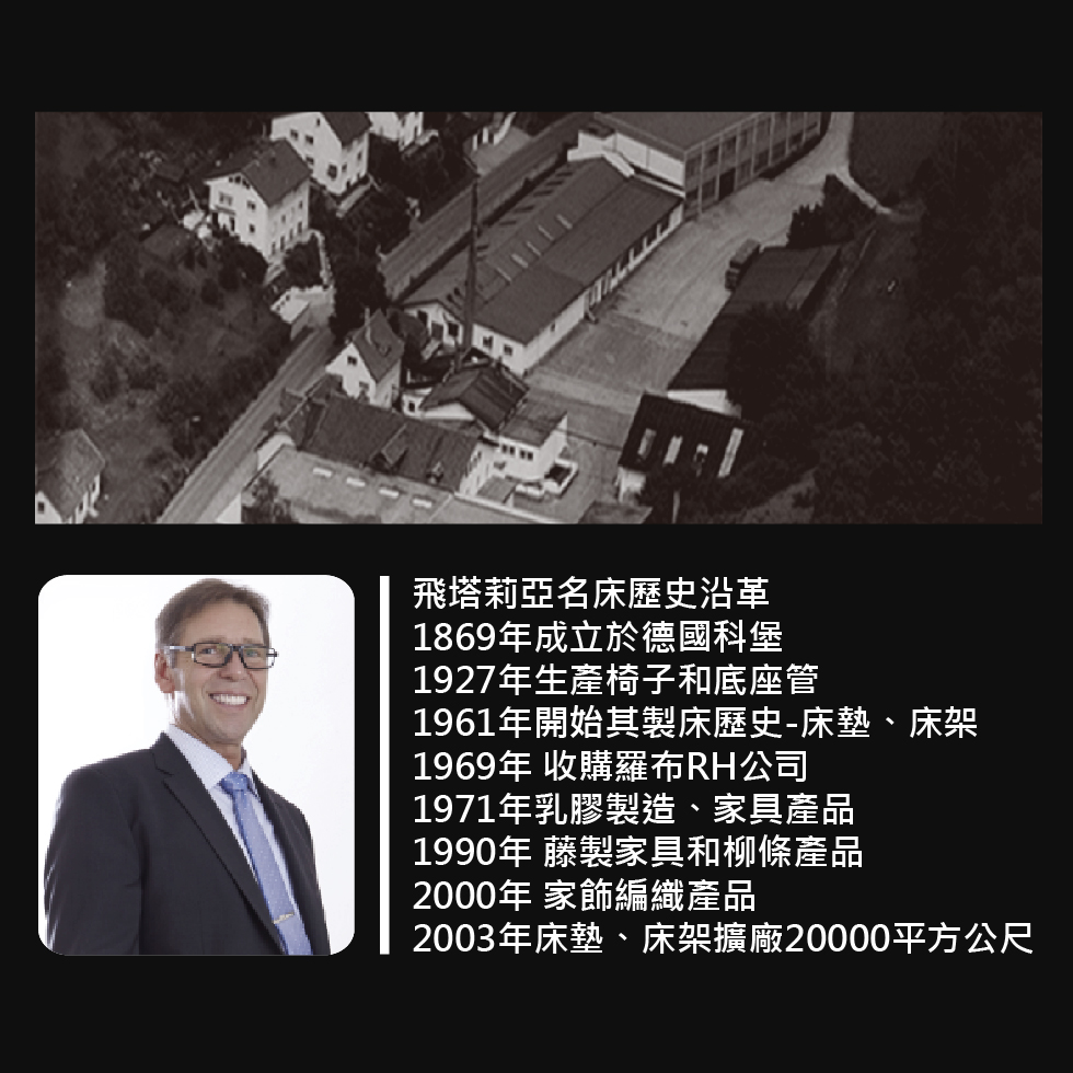 百年歷史Fitalia飛塔莉亞名床德國原廠於西元1869年創立。草創時期工廠建於1953年德國科堡的貨運集散站,以現代的角度來看有著紀念性博物館的特質。隨著日益增進的製床技術,今日的Fitalia於總面積近20,000平方公尺的廠房生產製造各式樣的精品名床,更不斷研發創新材質、無毒健康材料,樹立德國科技製床的新典範。
